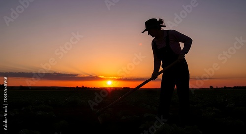Silhouette of a female farmer in overalls and a hat working in a field with a hoe during a beautiful, golden sunset