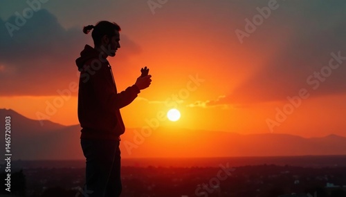 Silhouette of a figure holding a small shape against a sunset , quiet, shadow
