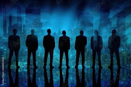 Silhouette of a group of business people outlines with a lit background. Generative AI