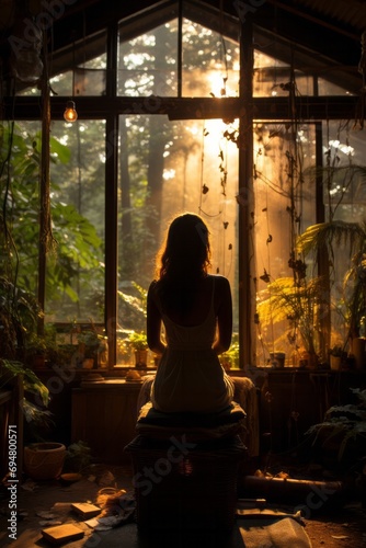 Silhouette of a lady bathed in the warm glow of sunshine through a wooden cottage window, Generative AI