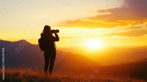 Silhouette of a lone photographer capturing the sunset over a mountainous landscape