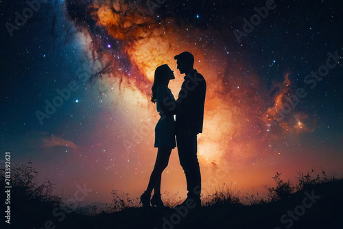 Silhouette of a loving couple holding and looking at each other. Cosmic background, bright vibrant colors.