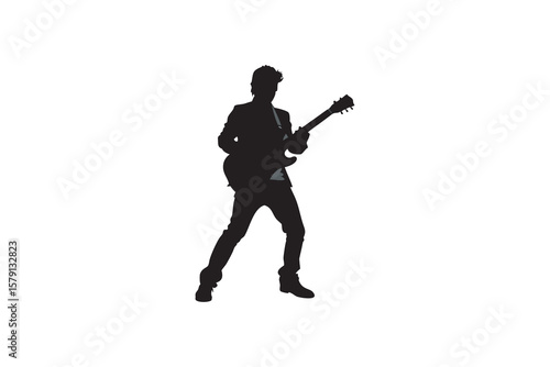 Silhouette of a male guitarist playing an electric guitar wearing a jacket and jeans isolated on a white background showcasing musical performance and artistic expression