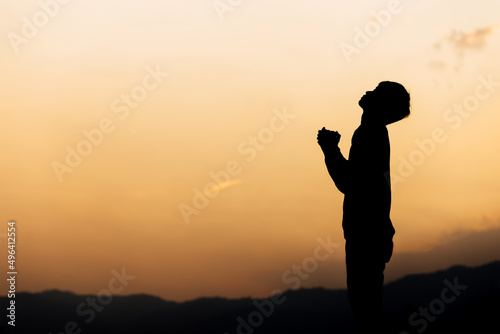 Silhouette of a man holding hands and prayer on mountain at sunset. concept of religion.