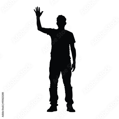 silhouette, man, raising, hand, greeting, adieu, attention, black, white, contrast, figure, person, standing, casual attire, communication, minimalist, outline, gesture, pose, background, monochrome, symbolic, cut-out, vector, graphic, abstract, design, art, isolated, shape, human, individual, concept, expression, message, element, illustration, drawing, flat