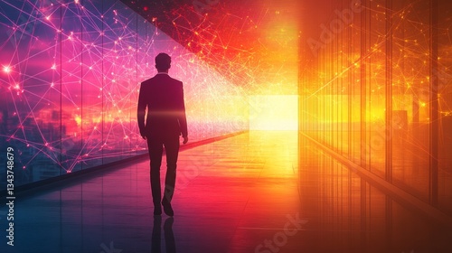 silhouette, man, walking, doorway, bright, light, future, technology, network, connection, abstract, architecture, building, modern, glasses, window, corridor, office, businessman, executive, leader, vision, success, ambition, achievement, career, digital, transformation, innovation, datum, ai, artificial, intelligence, city landscape, urban, skyline, sunset, sunrise, gradient, colourful, vibrant, pink, red, orange, yellow, perspective, contemporary