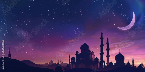 Silhouette of a mosque skyline against a starry twilight sky with a crescent moon.