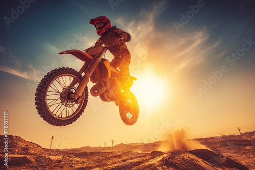 Silhouette of a motocross rider executing a daring jump over a dirt track against a brilliant sunset
