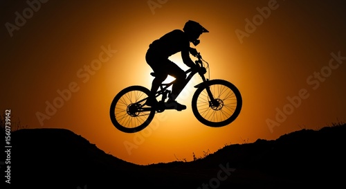 Silhouette of a mountain biker performing a jump against a golden sunset sky, showing freedom and adventure.
