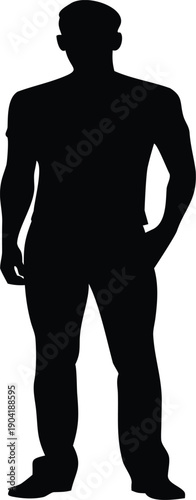 silhouette, man, male, figure, human, body, form, shape, standing, posing, casual attire, relaxed, pocket, hand, black, white, contrast, graphic, illustration, vector, design, isolated, simple, modern, minimalist, artwork, dark, light, negative, space, strength, power, muscular, anatomy, outline, shadow, portrait, lifestyle, person, clothing, jean, shirt, fashion, contemporary, monochrome