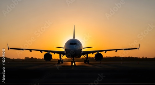 Silhouette of a passenger airplane front view on the airport runway against a dramatic golden sunrise.