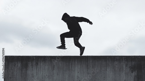 jump, jumping, person, silhouette, wall, concrete, urban, motion, active, movement, man, athletic, fitness, exercise, sport, energy, power, strength, speed, agility, dynamic, action, freedom, challenge, overcome, obstacle, determination, achievement, success, risk, daring, brave, bold, outside, sky, cloud, leap, vault, runner, running, footwear, apparel, clothing, leg, arm, body, human
