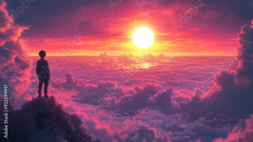 Silhouette of a Person Standing on a Cliff Above the Clouds at Sunset