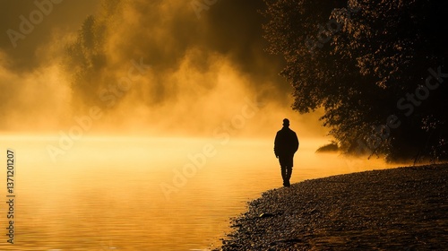 silhouette, person, walking, water, sunset, mist, atmosphere, nature, landscape, golden hour, calmness, calmness, river bank, tree, adventure, exploration, travel, photo, scenic view, peaceful, serene, morning, evening, light, shadow, environment, ecology, wildlife, natural beauty, seasonal, autumn, spring, summer, winter, mood, emotion, contemplation, solitude, recreation, leisure