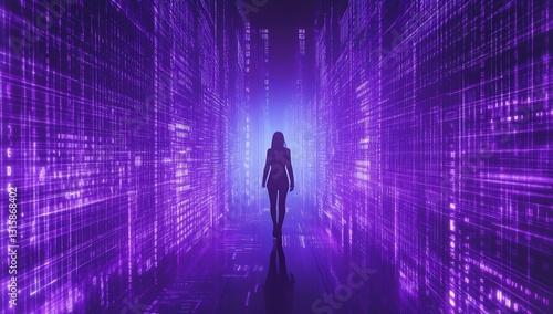 Silhouette of a person walking through a glowing path of binary code in an immersive purple-lit environment : Generative AI