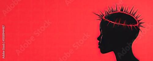 Silhouette of a person with a crown of thorns against a red background.