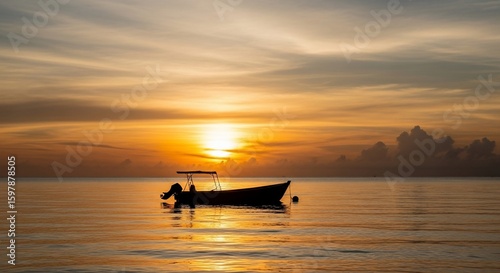 Silhouette of a small boat floating on calm water during a vibrant sunset, reflecting golden hues.