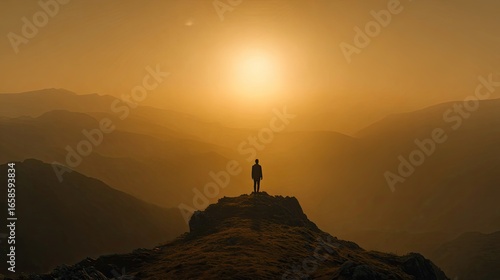 Silhouette of a solitary figure on a mountain at sunrise symbolizing solitude and new beginnings, photorealistic, warm golden light