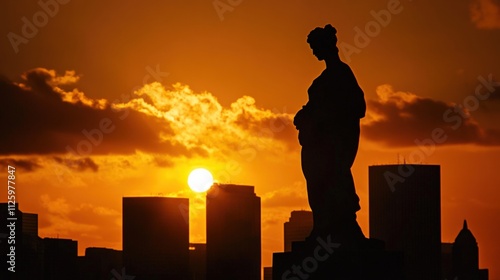 sunset, silhouette, statue, skyline, city, cloud, orange, dramatic, landscape, evening, urban, scenic, nature, art, architecture, photo, travel, background, beautiful, view