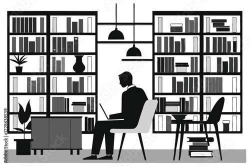 Silhouette of a thinking man on the library vector