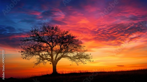 Silhouette of a tree against a vibrant sunset sky