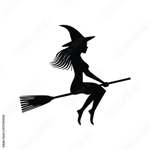 sorcerer, silhouette, flying, broomstick, halloween, magic, fantasy, woman, female, character, skittish, night, costume, long hair, leg, sitting, dark, black, white background, isolated, illustration, graphic, design, art, icon, symbol, folklore