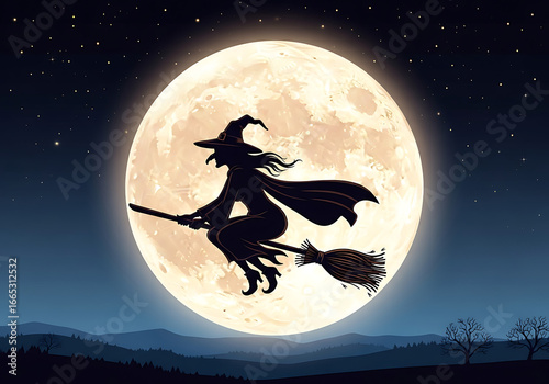 sorcerer, broomstick, full moon, silhouette, halloween, night, star, mountain, tree, fantasy, magic, wearing, cape, flying, across, front, large, bright, full, moon, background, bare, art, design, digital, modern, creative, conceptual, professional, detailed, artistic, illustration, graphic, visual, colourful, decorative, minimalist, contemporary
