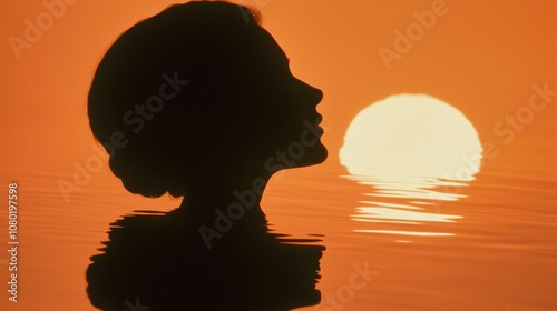 Silhouette of a woman basking in a glowing sunset, her reflection shimmering on the calm beach waters