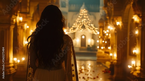 woman, silhouette, temple, night, candle, light, gown, magical, atmosphere, romantic, india, indian, culture, religion, spirituality, beautiful, elegant, graceful, mysterious, backview, long hair, gold, warm, dark, shadow, bokeh, architecture, pillar, ornate, wedding, ceremony, event, celebration, festival, prayer, peace, serene, calm, fairy tale, dreamlike, mystical, tradition, heritage, travel, journey