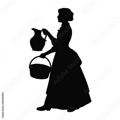 silhouette, woman, historical, dress, jug, basket, carrying, vintage, old, fashioned, period, costume, black, and, white, outline, figure, person, domestic, labor, water, carrier, farm, countryside, rural, art, illustration, drawing, graphic, icon
