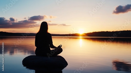 Silhouette of a woman meditating on a rock by a lake at sunset, peaceful and serene atmosphere, golden hour light reflecting on the water. : Generative AI