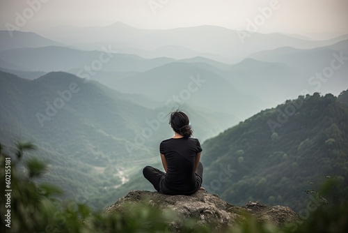 pose, empty, nirvana, seclusion, fog, calmness, training, solitude, care, relax, person, practicing, concentration, serene, harmony, lotus, outdoors, morning, sunset, spirit, yoga, female, cloud, space, peace, health, breathe, stillness, concept, silence, balance, lifestyle, practice, nature, backview, meditation, photo, composure, sky, quiet, perfection, woman, serenity, exercise, pranayama, calm, mountain summit, generative, ai