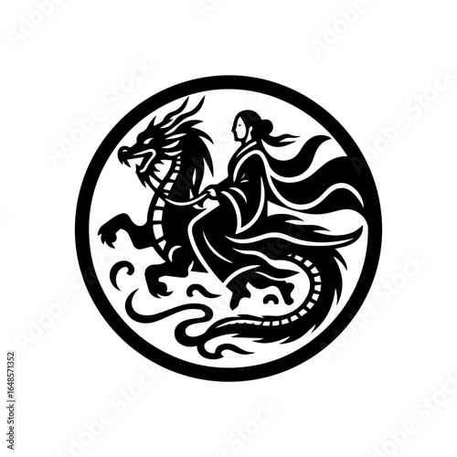 dragon, woman, rider, silhouette, circle, illustration, art, design, graphic, mythical, creature, fantasy, legend, folklore, chinese, asian, culture, traditional, symbol, power, strength, courage, freedom, flight, movement, dynamic, elegant, graceful, flowing, robe, hair, stylised, detailed, intricate, bold, strong, confident, epic, majestic, ancient, history, mythology, emblem, icon, logotype, decorative, ornamental, black, white