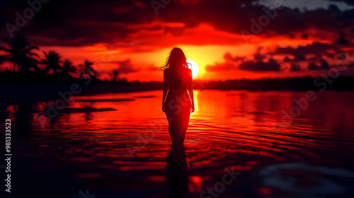 Silhouette of a Woman Walking into the Sunset, Red Sky and Water