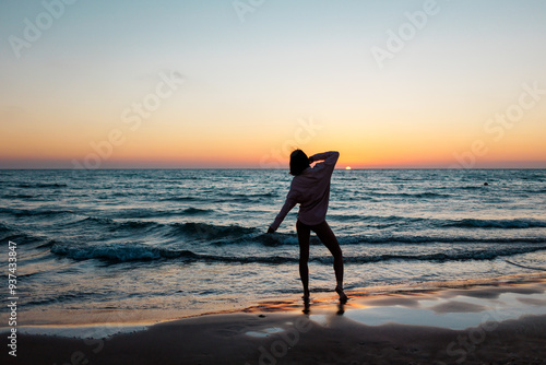 Silhouette of a woman watching the sunset on the beach. Summer mood.
