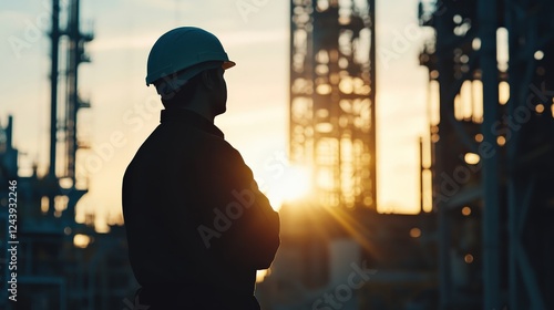 Silhouette of a worker in a hard hat observing a sunset at an industrial site