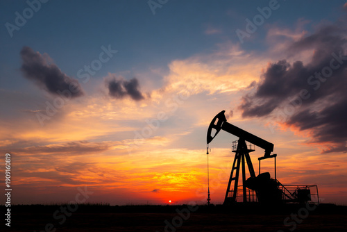 Silhouette of an oil pump jack pumping crude oil under a vibrant, cloudy sunset sky with a low horizon.