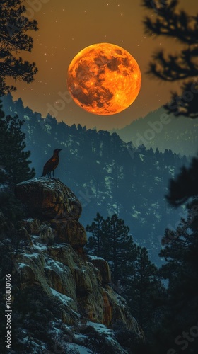 moon, night, bird, mountain, orange, landscape, nature, sky, star, rock, silhouette, tree, forest, winter, cold, dark, scenic, view, wildlife, animal, scene, serenity, mystical, magical, majestic, picturesque, beautiful, amazing, awe, wonder, calmness, calm, peace, solitude, stillness, mystery, enigma, power, energy, light