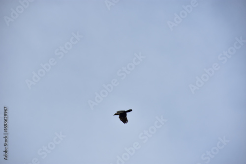 Silhouette of Birds Flying in Clear Blue Sky with Spread Wings, Flock and Single Crow Flight Captured in Natural Wildlife Freedom Concept Photography