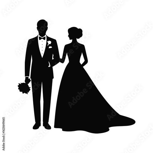 silhouette of bride and groom standing together in elegant wedding attire, romantic couple illustration with bouquet and formal outfits