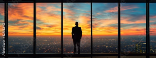 Silhouette of businessman standing in front of large window in a modern office overlooking the cityscape at sunrise, symbolizing personal growth and success in business or life concept. generative AI