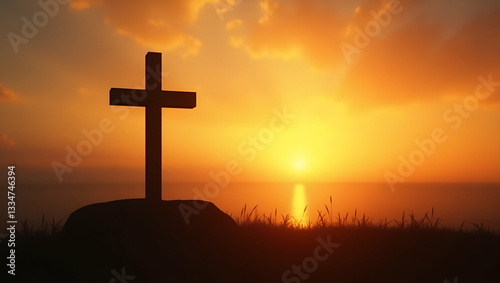 Silhouette of Catholic Cross Against Sunrise: A Symbol of Faith and New Beginnings in Serene Natural Backdrop - Perfect Photo Stock Concept with Empty Space for Text
