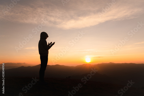 Silhouette of Christian woman praying worship at sunset. Christian Religion concept background. Hands in prayer. worship god with religion concept.