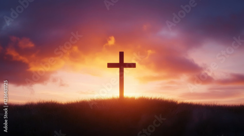 silhouette of cross against vibrant sunset sky, symbolizing faith and hope. scene evokes sense of peace and spirituality, perfect for reflecting on beliefs