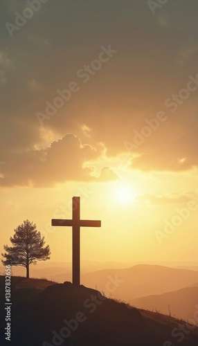 Silhouette of cross on hilltop with sunrise. Symbolic image of faith, spirituality, hope. Scene represents belief, religion, christianity, easter, gospel, resurrection, salvation, peace. Symbol of