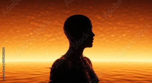 digital, human, silhouette, abstract, landscape, sunset, horizon, technology, futuristic, art, person, gold, glow, aethereal, form, design, virtual, cyberspace, artificial, intelligence, pixelated, glitch, avatar, profile, face, bust, shoulder, upper, body, serene, peaceful, dream, scape, creative, conceptual, visualisation, graphic, rendering, illustration, female, light, warm, glowing, background, imagination