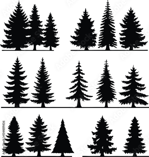 Silhouette of Evergreen Trees Set on White Background,Pine fir tree tall tree isolated premium vector image, black and white tree silhouettes,coniferous trees, pine trees,fir trees silhouettes set,Ai