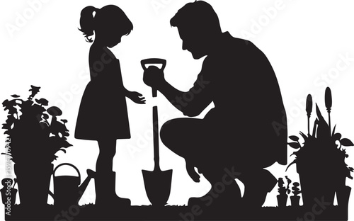 Silhouette of father and daughter gardening vector in white background