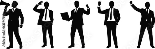 Silhouette of five business men in various poses, corporate leadership concept, office communication, motivation, gesture expression, professional illustration vector