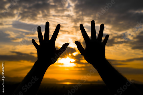 Silhouette of hands against sunset sky with clouds